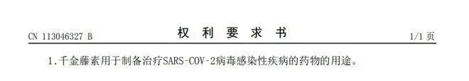 這件專利授權的權利要求只有一個,而且只有短短一句話:“1.千金藤素用于制備治療SARS-COV-2病毒感染性疾病的藥物的用途。”