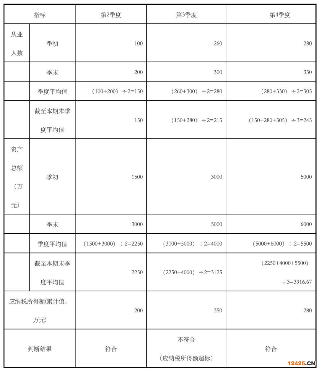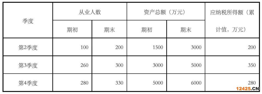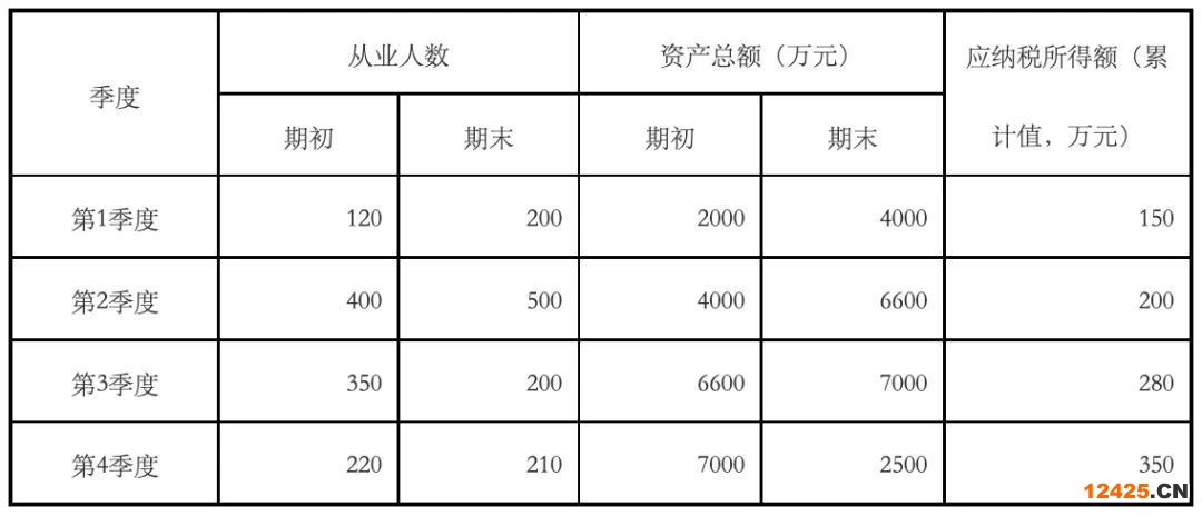 例1.a企業(yè)2020年成立,從事國家非限制和禁止行業(yè),2022年各季度的資產(chǎn)總額、從業(yè)人數(shù)以及累計(jì)應(yīng)納稅所得額情況如下表所示: