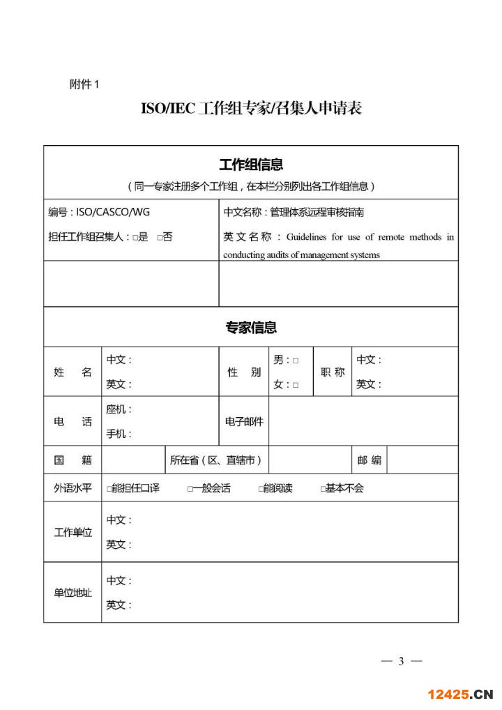 附件:1.ISO/IEC工作組專家/召集人申請表2.認(rèn)證認(rèn)可國際組織工作組專家申請表3.中英文個(gè)人簡歷模板
