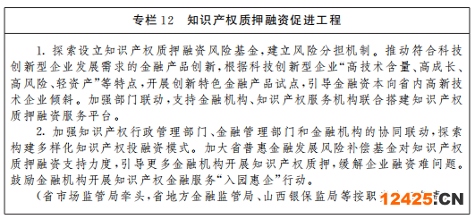 鼓勵銀行、擔保、創(chuàng)業(yè)投資、保險等金融機構(gòu)創(chuàng)新知識產(chǎn)權(quán)金融新產(chǎn)品,與科技型中小企業(yè)開展知識產(chǎn)權(quán)轉(zhuǎn)移轉(zhuǎn)化項目金融服務對接,對專利權(quán)、商標專用權(quán)、著作權(quán)、植物新品種等知識產(chǎn)權(quán)進行打包組合質(zhì)押。探索社會資金參與知識產(chǎn)權(quán)質(zhì)押融資基金運作的路徑和模式。完善知識產(chǎn)權(quán)質(zhì)物處置機制。健全知識產(chǎn)權(quán)出資入股和退出機制。探索知識產(chǎn)權(quán)證券化,依托上海、深圳證券交易所證券交易體系,試行將知識產(chǎn)權(quán)相關(guān)債權(quán)資產(chǎn)實現(xiàn)真實出售。鼓勵保險公司開發(fā)知識產(chǎn)權(quán)保險新產(chǎn)品。(省市場監(jiān)管局牽頭,省委宣傳部、省地方金融監(jiān)管局、山西銀保監(jiān)局、山西證監(jiān)局等按職責分工負責)