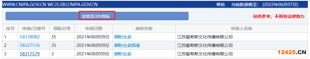 CP粉的別稱“顧盼生姿”目前只被申請(qǐng)3件。