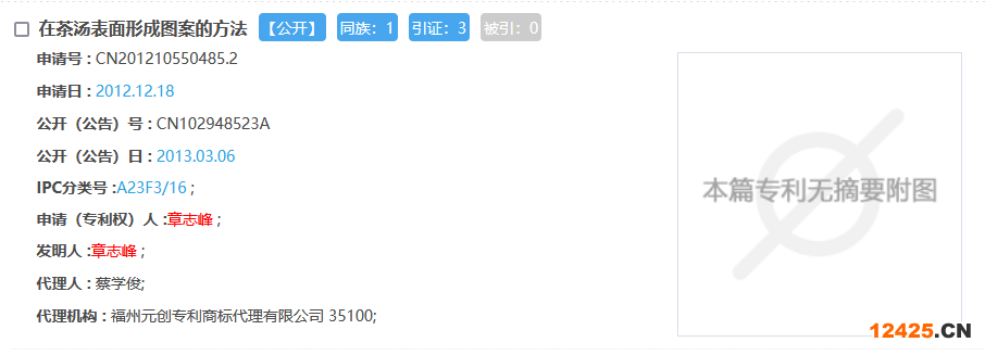 據(jù)查詢,章志峰申獲的CN201210550485.2號(hào)發(fā)明專利,涉及一種在茶湯表面形成圖案的方法。該方法在茶湯懸浮液表面加水或含水材料,占茶湯懸浮液重量的0.01-6%,使茶湯表面形成深淺顏色變化,根據(jù)需要繪制成各種圖案。