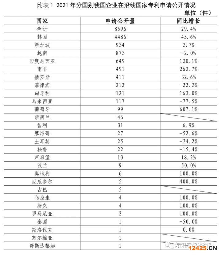 附表1 2021年分國別我國企業(yè)在沿線國家專利申請公開情況