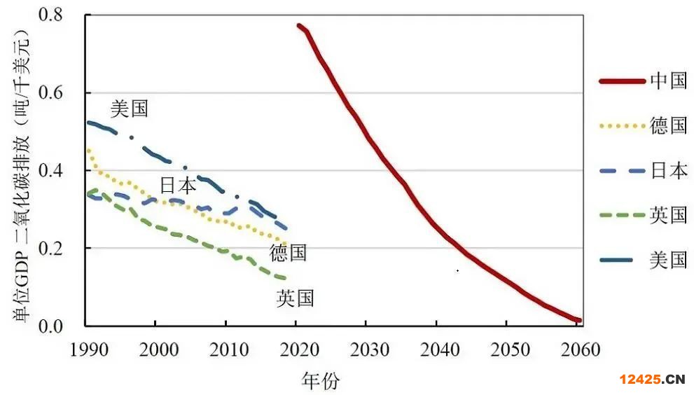 圖4 中國(guó)與主要發(fā)達(dá)國(guó)家單位GDP二氧化碳排放量對(duì)比