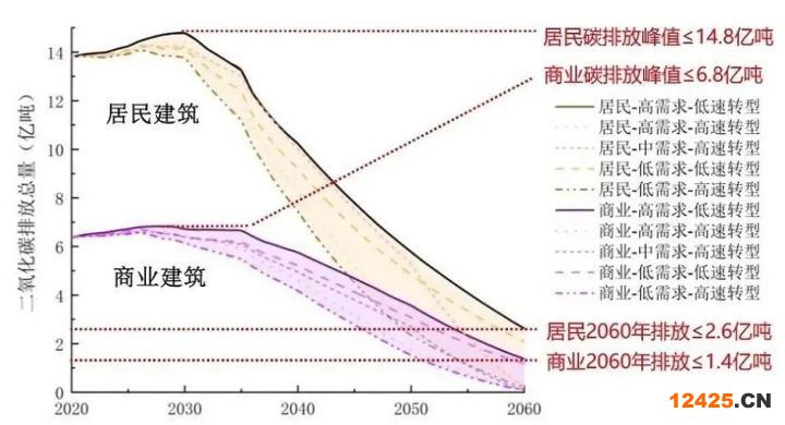 建筑部門(mén)包括公共建筑和居民建筑。在建筑運(yùn)行階段需要提供采暖、制冷、熱水、炊事、照明等能源服務(wù),由此產(chǎn)生大量的直接碳排放和間接碳排放。未來(lái)隨著人均收入的增加以及人均建筑面積的增長(zhǎng),預(yù)計(jì)建筑部門(mén)運(yùn)行階段的能源服務(wù)需求將由2020年的13.1億噸標(biāo)準(zhǔn)煤持續(xù)增長(zhǎng)至2060年的26~31.6億噸標(biāo)準(zhǔn)煤。其中,居民部門(mén)能源服務(wù)需求由2020年的7.3億噸標(biāo)準(zhǔn)煤增長(zhǎng)至2060年的11.5~14.6億噸標(biāo)準(zhǔn)煤。商業(yè)部門(mén)能源服務(wù)需求增速較居民部門(mén)更高,由2020年的5.8億噸標(biāo)準(zhǔn)煤增長(zhǎng)至2060年的14.4~17億噸標(biāo)準(zhǔn)煤,增長(zhǎng)1.5~1.9倍(圖14)。在滿足能源服務(wù)需求的前提下,為了低成本實(shí)現(xiàn)全國(guó)“雙碳”目標(biāo),居民建筑部門(mén)碳排放峰值需控制在14.8億噸CO2以內(nèi);商業(yè)建筑部門(mén)碳排放峰值不超過(guò)6.8億噸CO2;建筑部門(mén)累計(jì)CO2排放需在2027—2030年達(dá)峰,各種情景下,峰值不超過(guò)22億噸CO2.