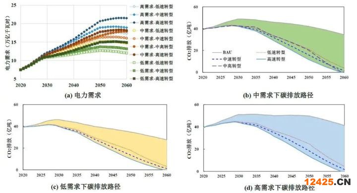 圖17 電力需求及不同需求模式下電力行業(yè)CO2排放路徑(不含終端行業(yè)自備電廠排放)