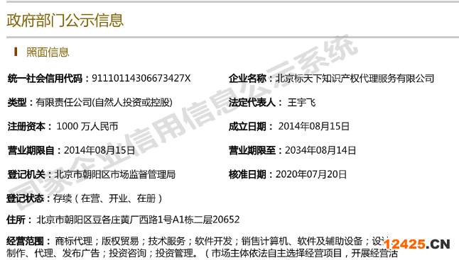河南標(biāo)天下知識產(chǎn)權(quán)代理服務(wù)有限公司成立于2020年8月26日,經(jīng)營范圍為“知識產(chǎn)權(quán)代理服務(wù)、商標(biāo)代理服務(wù)”等。北京標(biāo)天下知識產(chǎn)權(quán)代理服務(wù)有限公司、河南標(biāo)天下知識產(chǎn)權(quán)代理服務(wù)有限公司具有關(guān)聯(lián)關(guān)系,兩公司法定代表人均為王宇飛。