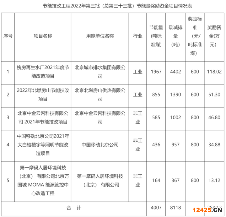 關(guān)于北京市用能單位節(jié)能技改工程2022年第三批(總第三十三批)節(jié)能量獎(jiǎng)勵(lì)資金項(xiàng)目公示的通知