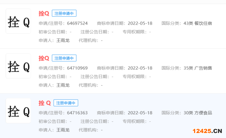 此外,“拴Q”也被搶注商標。據(jù)企查查信息顯示,自然人王某已申請注冊3個“拴Q”商標,國際分類分別為43類餐飲住宿、35類廣告銷售、30類方便食品,當前狀態(tài)為“等待實質審查”。“
