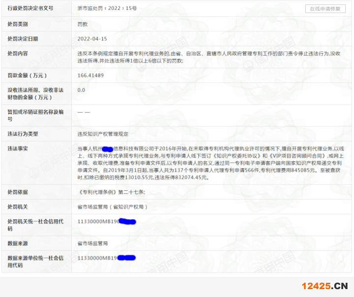 杭州某信息科技有限公司是業(yè)內(nèi)有一定名氣的知識(shí)產(chǎn)權(quán)服務(wù)機(jī)構(gòu)。執(zhí)法部門調(diào)查顯示,該公司在未取得專利機(jī)構(gòu)代理執(zhí)業(yè)許可的情況下,從2016年開始擅自以線上、線下兩種方式承攬專利代理業(yè)務(wù)。其中,包括與專利申請(qǐng)人線下簽訂《知識(shí)產(chǎn)權(quán)委托協(xié)議》和《VIP項(xiàng)目咨詢顧問合同》,或網(wǎng)上承攬業(yè)務(wù)、收取代理費(fèi)。至被查處時(shí),該公司共為137個(gè)專利申請(qǐng)人代理專利申請(qǐng)566件,收取專利代理費(fèi)用84萬余元。