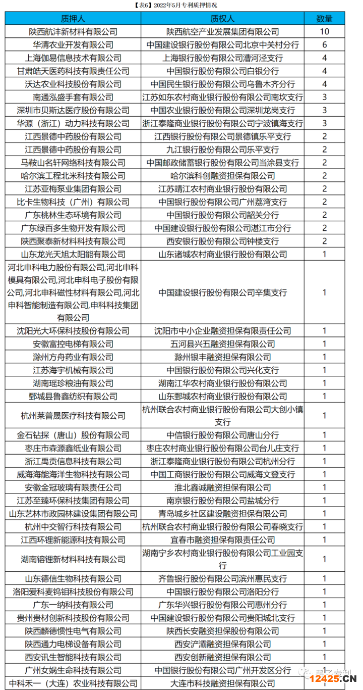 2022年5月發(fā)生專利質(zhì)押情況詳見【表6】。