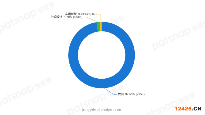 專利類型的分布反映該企業(yè)專注于保護(hù)創(chuàng)新的功能還是外觀,通常情況下,發(fā)明專利占比越高,則創(chuàng)新程度越高。圖中可以看出華為公司發(fā)明專利占比高達(dá)97.50%。