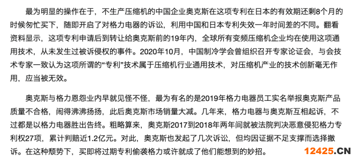 文章還提到,“翻看資料顯示,這項專利申請后到轉(zhuǎn)讓給奧克斯前的19年內(nèi),全球所有變頻壓縮機企業(yè)均在使用這項通用技術(shù),從未發(fā)生過被訴侵權(quán)的事件。2020年10月,中國制冷學會曾組織召開專家論證會,與會技術(shù)專家一致認為這項所謂的‘專利’技術(shù)屬于壓縮機行業(yè)通用技術(shù)。應當被無效。”