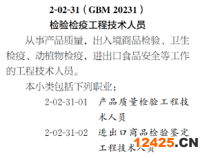 根據(jù)分類表查詢《大典》公示稿(正文)第79頁,明示“2-02-31(GBM 20231) 檢驗(yàn)檢疫工程技術(shù)人員”定義為“從事產(chǎn)品質(zhì)量,出入境商品檢驗(yàn)、衛(wèi)生檢疫、動(dòng)植物檢疫,進(jìn)出口食品安全工作的工程技術(shù)人員”。包括以下6類:“2-02-31-01 產(chǎn)品質(zhì)量檢驗(yàn)工程技術(shù)人員、2-02-31-02 進(jìn)出口商品檢驗(yàn)鑒定工程技術(shù)人員、2-02-31-03 進(jìn)出境動(dòng)物和植物檢驗(yàn)人員L、2-02-31-04 特種設(shè)備檢驗(yàn)檢測工程技術(shù)人員、2-02-31-05 纖維質(zhì)量檢驗(yàn)工程技術(shù)人員、2-02-31-06 衛(wèi)生檢疫人員”。其中綠色職業(yè)1類。