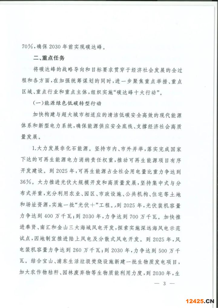 1. 大力發(fā)展非化石能源。堅持市內(nèi)、市外并舉,落實完成國家下達的可再生能源電力消納責(zé)任權(quán)重,推動可再生能源項目有序開發(fā)建設(shè)。到2025年,可再生能源占全社會用電量比重力爭達到36%。大力推進光伏大規(guī)模開發(fā)和高質(zhì)量發(fā)展,堅持集中式與分布式并重,充分利用農(nóng)業(yè)、園區(qū)、市政設(shè)施、公共機構(gòu)、住宅等土地和場址資源,實施一批“光伏十“工程。,到2025年,光伏裝機容量力爭達到400萬千瓦;到2030年,力爭達到700萬千瓦。加快推進奉賢、南匯和金山三大海域風(fēng)電開發(fā),探索實施深遠海風(fēng)電示范試點,因地制宜推進陸上風(fēng)電及分散式風(fēng)電開發(fā)。到2025年,風(fēng)電裝機容量力爭達到260萬千瓦;到2030年,力爭達到500萬千瓦。結(jié)合寶山、浦東生活垃圾焚燒設(shè)施新建一批生物質(zhì)發(fā)電項目,加大農(nóng)作物秸桿、園林廢棄物等生物質(zhì)能利用力度,到2030年,生物質(zhì)發(fā)電裝機容量達到84萬千瓦。加快探索潮流能、波浪能、溫差能等海洋新能源開發(fā)利用。大力爭取新增外來清潔能源供應(yīng),進一步加大市外非化石能源電力的引入力度。加強與非化石能源資源豐富的地 區(qū)合作,建設(shè)大型非化石能源基地,合理布局新增和擴建市外清潔能源通道(可再生能源電量比例原則上不低于