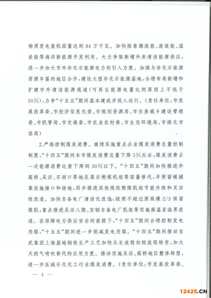 制度“,十四五”期間本市煤炭消費總量下降5%左右,煤炭消費占一次能源消費比重下降到30%以下。“十四五”期間加快推進外高橋、吳涇、石潤口等地區(qū)落后燃煤機組等容量替代,并預(yù)留碳捕集設(shè)施接口和場地,同步推進其他現(xiàn)役燃煤機組節(jié)能升級和靈活性改造。加快自備電廠清潔化改選,按照不超過原規(guī)模2/3保留煤機,重點推進吳涇八期、寶鋼自備電廠機組等實施高溫亞臨界改造。在保障電力供應(yīng)安全的前提下“,十四五”期間合理控制發(fā)電用煤,”十五五”期間進一步削減發(fā)電用煤。“十四五”期間推動寶武集團上?;劁撹F生產(chǎn)工藝加快從長流程向短流程轉(zhuǎn)變,加大天然氣噴吹替代的應(yīng)用力度。推動實施吳涇、高橋地區(qū)整體轉(zhuǎn)型,進一步壓減石化化工行業(yè)煤炭消費。(責(zé)任單位:市發(fā)展改革委、市經(jīng)濟信息化委、市生態(tài)環(huán)境局)