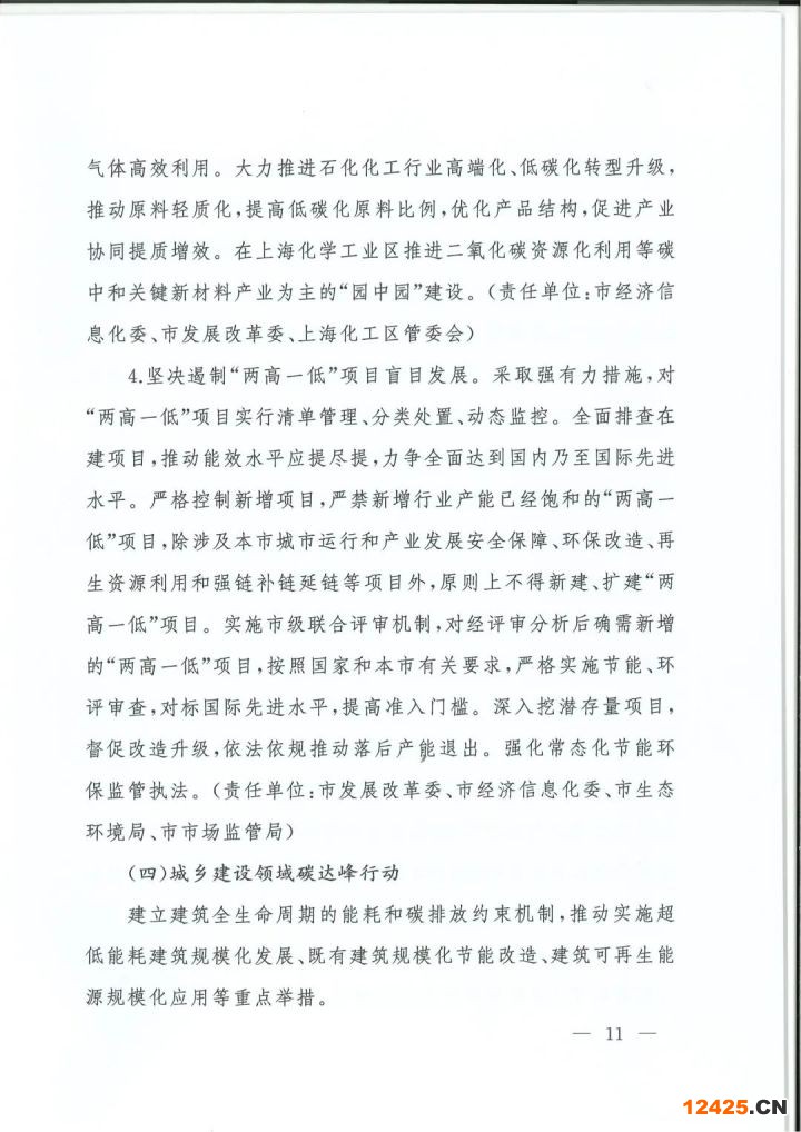 4. 堅決遏制“兩高一低“項目盲目發(fā)展。采取強有力措施,對“兩高一低”項目實行清單管理、分類處置、動態(tài)監(jiān)控。全面排查在建項目,推動能效水平應(yīng)提盡提,力爭全面達到國內(nèi)乃至國際先進水平。嚴格控制新增項目,嚴禁新增行業(yè)產(chǎn)能巳經(jīng)飽和的“兩高一低”項目,除涉及本市城市運行和產(chǎn)業(yè)發(fā)展安全保障、環(huán)保改造、再生資源利用和強鏈補鏈延鏈等項目外,原則上不得新建、擴建“兩高一低”項目。實施市級聯(lián)合評審機制,對經(jīng)評審分析后確需新增的“兩高一低”項目,按照國家和本市有關(guān)要求,嚴格實施節(jié)能、環(huán)評審查,對標(biāo)國際先進水平,提高準入門檻。深入挖潛存量項目,督促改造升級,依法依規(guī)推動落后產(chǎn),歸退出。強化常態(tài)化節(jié)能環(huán)保監(jiān)管執(zhí)法。(責(zé)任單位:市發(fā)展改革委、市經(jīng)濟信息化委、市生態(tài)環(huán)境局、市市場監(jiān)管局)