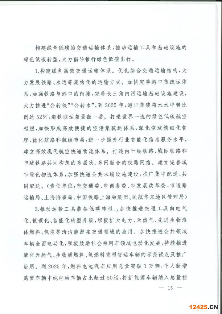 1. 構(gòu)建綠色高效交通運輸體系。優(yōu)化綜合交通運輸結(jié)構(gòu),大力發(fā)展鐵路、水運等集約化的運輸方式。加快完善港口集疏運體系,加強鐵路與港口的銜接,完善長三角內(nèi)河運輸基礎(chǔ)設(shè)施建設(shè),大力推進“公轉(zhuǎn)鐵”“公轉(zhuǎn)水“,到2025年,港口集裝箱水水中轉(zhuǎn)比例達52%,海鐵聯(lián)運箱量翻一番。打造世界一流的綠色低碳航空樞紐,加快形成高效便捷的空港集疏運體系,深化空域精細化管理,優(yōu)化航路和航線布局,進一步提升行業(yè)智能化信息服務(wù)水平,建立高效現(xiàn)代航空快遞物流體系。打造由于線鐵路、城際鐵路和市域鐵路共同構(gòu)筑的多層次、多網(wǎng)融合的鐵路網(wǎng)絡(luò)。建立完善城市綠色物流體系,加強快遞公共末端設(shè)施建設(shè),推廣集中配送、共同配送。(貴任單位:市交通委、市商務(wù)委、市發(fā)展改革委、市道路運輸局、上海海事局、中國鐵路上海局集團、民航華東地區(qū)管理局)