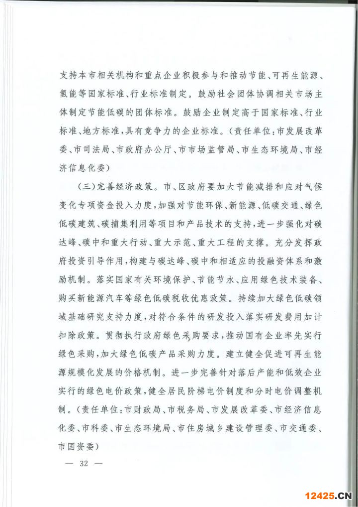 (三)完善經(jīng)濟政策。市、區(qū)政府要加大節(jié)能減排和應(yīng)對氣候變化專項資金投入力度,加強對節(jié)能環(huán)保、新能源、低碳交通、綠色低碳建筑、碳捕集利用等項目和產(chǎn)品技術(shù)的支持,進一步強化對碳達峰、碳中和重大行動、重大示范、重大工程的支撐。充分發(fā)揮政府投資引導(dǎo)作用,構(gòu)建與碳達峰、碳中和相適應(yīng)的投融資體系和激勵機制。落實國家有關(guān)環(huán)境保護、節(jié)能節(jié)水、應(yīng)用綠色技術(shù)裝備、購買新能源汽車等綠色低碳稅收優(yōu)惠政策。持續(xù)加大綠色低碳領(lǐng)域基礎(chǔ)研究支持力度,對符合條件的研發(fā)投入落實研發(fā)費用加計扣除政策。貫徹執(zhí)行政府綠色為購要求,推動國有企業(yè)率先實行綠色采購,加大綠色低碳產(chǎn)品采購力度。建立健全促進可再生能源規(guī)?;l(fā)展的價格機制。進一步完善針對落后產(chǎn)能和低效企業(yè)實行的綠色電價政策,健全居民階梯電價制度和分時電價調(diào)整機制。(責(zé)任單位:市財政局、市稅務(wù)局、市發(fā)展改革委、市經(jīng)濟信息化委、市科委、市生態(tài)環(huán)境局、市住房城鄉(xiāng)建設(shè)管理委、市交通委、市國資委)