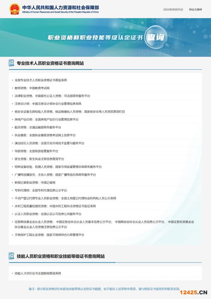 近日,人力資源和社會保障部在其門戶網(wǎng)站開設(shè)“職業(yè)資格和職業(yè)技能等級認(rèn)定證書查詢”專欄,公布了20個專業(yè)技術(shù)人員職業(yè)資格證書查詢網(wǎng)站和技能人才評價證書全國聯(lián)網(wǎng)查詢系統(tǒng),其中包括認(rèn)證人員職業(yè)資格。