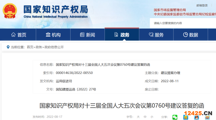國(guó)家知識(shí)產(chǎn)權(quán)局對(duì)十三屆全國(guó)人大五次會(huì)議第0760號(hào)建議答復(fù)的函