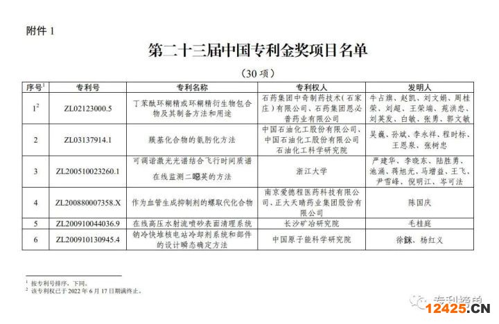國家知識產(chǎn)權局公布第23屆中國專利獎項目名單,30項專利金獎名單出爐