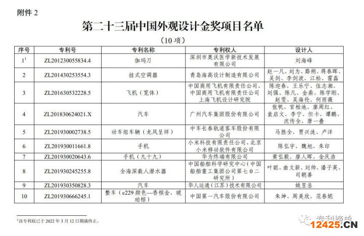 第23屆中國外觀設計金獎項目名單(10項)