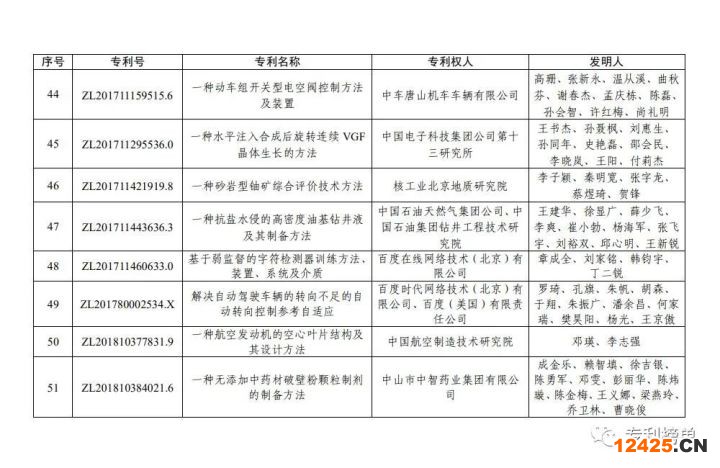 根據(jù)《中國專利獎評獎辦法》規(guī)定,經(jīng)國務院有關部門知識產(chǎn)權工作管理機構、地方知識產(chǎn)權局、有關全國性行業(yè)協(xié)會,以及中國科學院院士和中國工程院院士等推薦,中國專利獎評審委員會評審,社會公示,國家知識產(chǎn)權局和世界知識產(chǎn)權組織決定授予“丁苯酞環(huán)糊精或環(huán)糊精衍生物包合物及其制備方法和用途”等30項發(fā)明、實用新型專利中國專利金獎,“伽馬刀”等10項外觀設計專利中國外觀設計金獎;國家知識產(chǎn)權局決定授予“一種治療小兒食積咳嗽的中藥組合物及其制備方法”等60項發(fā)明、實用新型專利中國專利銀獎,“中子活化多元素分析儀”等15項外觀設計專利中國外觀設計銀獎;國家知識產(chǎn)權局決定授予“有效部位藥物沉積得到改善的干粉組合物”等791項發(fā)明、實用新型專利中國專利優(yōu)秀獎,“LED庭院燈(中式)”等52項外觀設計專利中國外觀設計優(yōu)秀獎;國家知識產(chǎn)權局決定授予江蘇省知識產(chǎn)權局等8家單位中國專利獎最佳組織獎,中國科學院科技促進發(fā)展局等20家單位中國專利獎優(yōu)秀組織獎,舒興田等18位院士中國專利獎最佳推薦獎。
