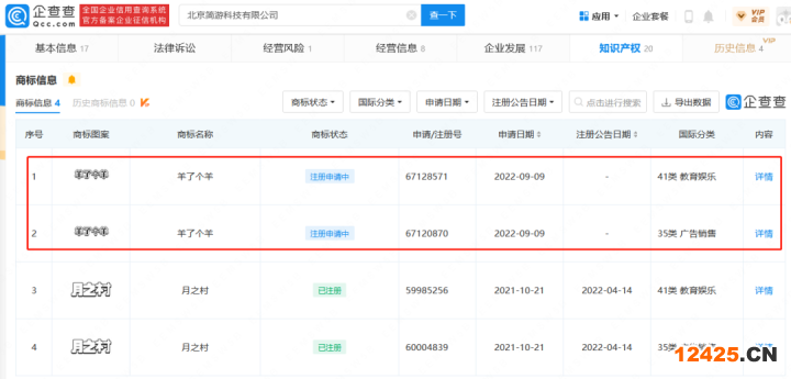 據(jù)企查查顯示,“羊了個(gè)羊”商標(biāo)已被多方申請(qǐng)注冊(cè),申請(qǐng)人除該游戲開發(fā)公司北京簡(jiǎn)游科技有限公司(下稱“簡(jiǎn)游科技”)外,還包括內(nèi)蒙古某生物科技公司、宿遷市某戶外用品公司及自然人王某等,國際分類涉及廣告銷售、食品、教育娛樂等,當(dāng)前商標(biāo)狀態(tài)均為申請(qǐng)中。