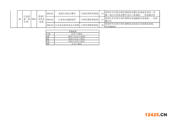 第五條專利代理機(jī)構(gòu)和專利代理師信用等級(jí)按照從高到低順序分為四級(jí),分別為“A”、“B”、“C”、“D”級(jí),按計(jì)分情況評(píng)價(jià)。計(jì)分滿分為100分,根據(jù)負(fù)面信息予以扣減。負(fù)面信息包括不規(guī)范經(jīng)營(yíng)或執(zhí)業(yè)行為、機(jī)構(gòu)經(jīng)營(yíng)異常情況、受行政或刑事處罰、行業(yè)懲戒等情況。等級(jí)標(biāo)準(zhǔn)如下: