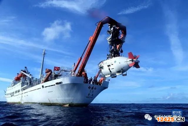 在西太平洋海域,“蛟龍”號(hào)載人潛水器離開(kāi)“向陽(yáng)紅09”科學(xué)考察船準(zhǔn)備進(jìn)入水中,進(jìn)行中國(guó)大洋38航次最后一潛(2017年6月13日攝)。新華社記者 劉詩(shī)平 攝