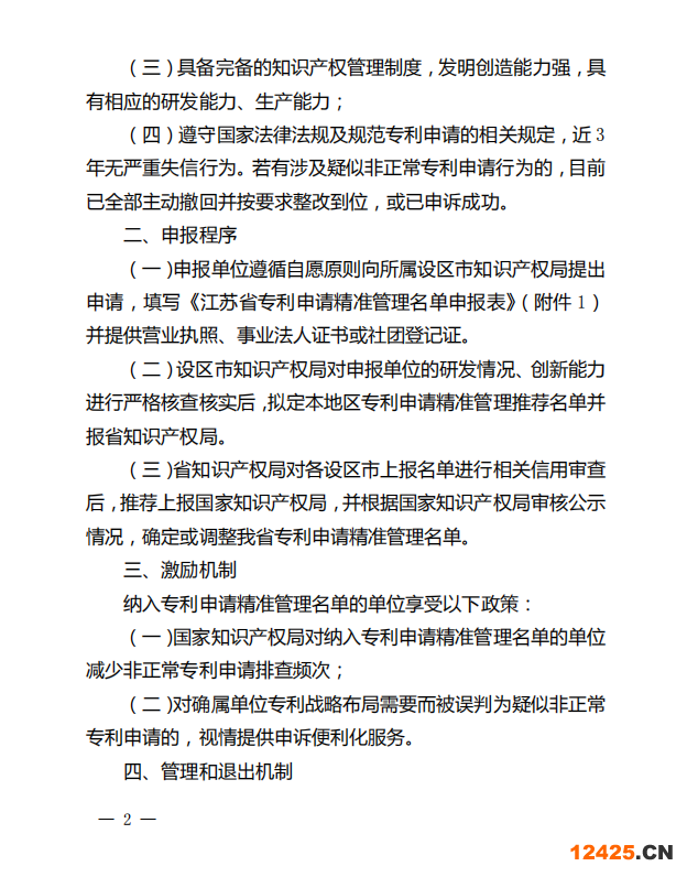 (二)創(chuàng)新主體申報(bào)信息與事實(shí)不符或填報(bào)虛假信息的,創(chuàng)新主體有非正常專利申請(qǐng)行為,且沒(méi)有按照國(guó)家知識(shí)產(chǎn)權(quán)局相關(guān)規(guī)定按時(shí)整改的,或有其他違反專利法律法規(guī)有關(guān)規(guī)定的,移出精準(zhǔn)管理名單,并依法依規(guī)處置。