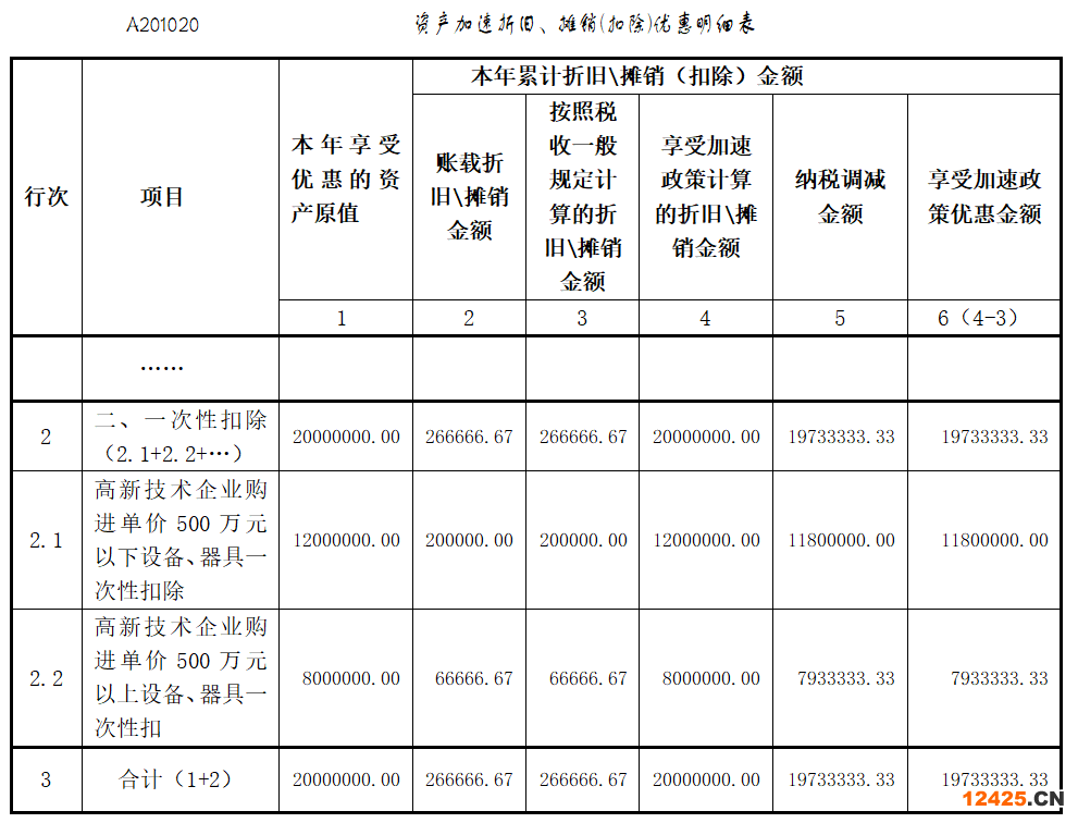 第一步,先填報一次性扣除情況。對于單價500萬元以下設備、器具,在《資產(chǎn)加速折舊、攤銷(扣除)優(yōu)惠明細表》(A201020)第2行“二、一次性扣除”下的明細行次中填寫“高新技術企業(yè)購進單價500萬元以下設備、器具一次性扣除”事項及“本年享受優(yōu)惠的資產(chǎn)原值”等信息;對于單價500萬元以上設備、器具,填寫“高新技術企業(yè)購進單價500萬元以上設備、器具一次性扣除”事項及“本年享受優(yōu)惠的資產(chǎn)原值”等信息。填寫完畢后,將該表單中“納稅調減金額”列次的合計值(第3行第5列)填寫在《中華人民共和國企業(yè)所得稅月(季)度預繳納稅申報表(A類)》(A202000)第6行“資產(chǎn)加速折舊、攤銷(扣除)調減額(填寫A201020)”中。