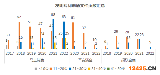 圖6為三家公司發(fā)明專利申請文件的頁數(shù)匯總圖,如圖6和表2可知,馬上消費的發(fā)明專利申請文件的頁數(shù)為10頁及以內占比3%,分布在2017和2018年;11-20頁占比50%,主要分布在2018-2021年;21-30頁占比37.5%、主要分布在2021年和2022年;31-40頁占比8.9%,主要分布在2021年和2022年??梢钥闯觯R上消費專利申請文件的質量在2018年有明顯改善,且之后幾年顯著提升。