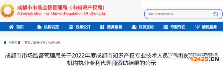 成都市市場(chǎng)監(jiān)督管理局關(guān)于2022年度成都市知識(shí)產(chǎn)權(quán)專業(yè)技術(shù)人員職稱和知識(shí)產(chǎn)權(quán)服務(wù)機(jī)構(gòu)執(zhí)業(yè)專利代理師資助結(jié)果的公示