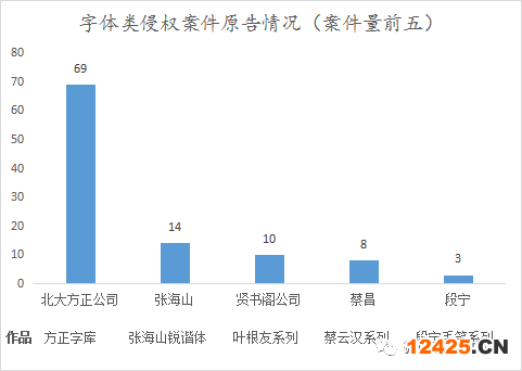 在字體類(lèi)著作權(quán)侵權(quán)糾紛中,訴訟量處于前五的原告主體包括北京北大方正電子有限公司(以下簡(jiǎn)稱(chēng)“方正公司”)、張海山、杭州賢書(shū)閣文化創(chuàng)意有限公司(以下簡(jiǎn)稱(chēng)“賢書(shū)閣公司”)、蔡昌、段寧。