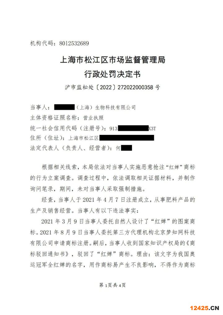 行政處罰決定書文號(hào):滬市監(jiān)松處〔2022〕272022000358號(hào)