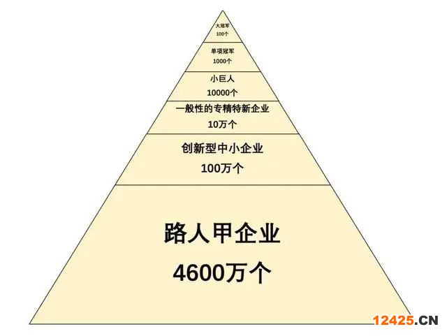 可以暢想一下,2025年前后,中國(guó)量大面廣、鋪天蓋地的中小企業(yè)將被重組成一個(gè)巨大的金字塔。從上到下,分別是:大冠軍(類(lèi)似格力、三一重工這樣的龍頭企業(yè))、單項(xiàng)冠軍(有獨(dú)門(mén)絕技的、全球市場(chǎng)名列前三的)、小巨人、一般性的專(zhuān)精特新、創(chuàng)新型中小企業(yè)、普通的路人甲型企業(yè)。