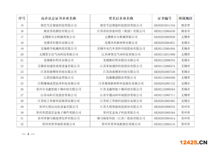 根據(jù)《高新技術(shù)企業(yè)認(rèn)定管理辦法》(國(guó)科發(fā)火〔2016〕32號(hào))、《高新技術(shù)企業(yè)認(rèn)定管理工作指引》(國(guó)科發(fā)火〔2016〕195號(hào))、《高新技術(shù)企業(yè)更名操作規(guī)程(試行)》(蘇高企協(xié)辦〔2017〕6號(hào))及《關(guān)于高新技術(shù)企業(yè)申請(qǐng)更名與辦理整體遷移有關(guān)事項(xiàng)的補(bǔ)充通知》(蘇高企協(xié)辦〔2019〕6號(hào))有關(guān)規(guī)定,擬同意南京友杰醫(yī)藥科技有限公司等52家高新技術(shù)企業(yè)(名單見(jiàn)附件)更名并予以公示。有關(guān)事宜通知如下: