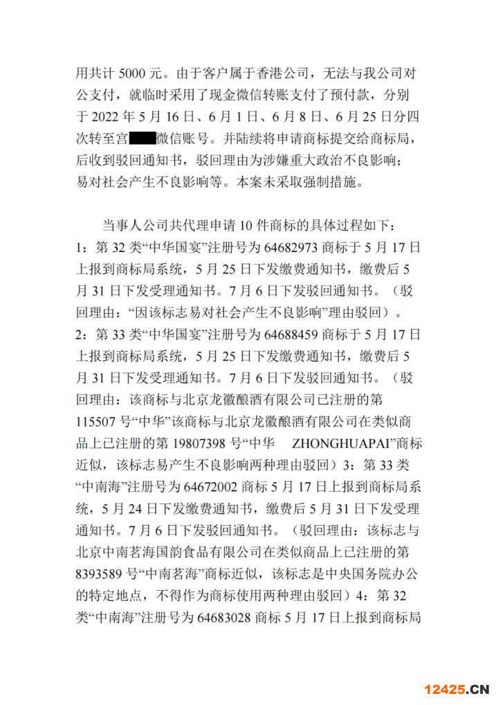 北京代理公司共代理申請10件商標的具體過程如下:1:第32類“中華國宴”注冊號為64682973商標于5月17日上報到商標局系統(tǒng),5月25日下發(fā)繳費通知書,繳費后5月31日下發(fā)受理通知書。7月6日下發(fā)駁回通知書。(駁回理由:“因該標志易對社會產(chǎn)生不良影響”理由駁回)。2:第33類“中華國宴”注冊號為64688459商標于5月17日上報到商標局系統(tǒng),5月25日下發(fā)繳費通知書,繳費后5月31日下發(fā)受理通知書。7月6日下發(fā)駁回通知書。(駁回理由:該商標與北京龍徽釀酒有限公司已注冊的第115507號“中華”該商標與北京龍徽釀酒有限公司在類似商品上已注冊的第19807398號“中華ZHONGHUAPAI”商標近似,該標志易產(chǎn)生不良影響兩種理由駁回)3:第33類“中南海”注冊號為64672002商標5月17日上報到商標局系統(tǒng),5月24日下發(fā)繳費通知書,繳費后5月31日下發(fā)受理通知書。7月6日下發(fā)駁回通知書。(駁回理由:該標志與北京中南茗海國韻食品有限公司在類似商品上已注冊的第8393589號“中南茗海”商標近似,該標志是中央國務院辦公的特定地點,不得作為商標使用兩種理由駁回)4:第32類“中南海”注冊號為64683028商標5月17日上報到商標局系統(tǒng),5月26日下發(fā)繳費通知書,繳費后6月6日下發(fā)受理通知書。7月6日下發(fā)駁回通知書。(駁回理由:該標志與北京中南茗海國韻食品有限公司在類似商品上已注冊的第8393589號“中南茗海”商標近似,該標志是中央國務院辦公的特定地點,不得作為商標使用兩種理由駁回)5:第32類“中華”注冊號為65031376商標6月1日上報到商標局系統(tǒng)6月10日下發(fā)繳費通知書,繳費后6月21日下發(fā)受理通知書,7月8日下發(fā)駁回通知書。(駁回理由:該標志為我國國家名稱不得作為商標使用理由駁回)6:和第32類“國宴”注冊號為65022970兩個商標6月1日上報到商標局系統(tǒng)6月10日下發(fā)繳費通知書,繳費后6月21日下發(fā)受理通知書,7月8日下發(fā)駁回通知書。(駁回理由:該標志用作商標易產(chǎn)生不良影響,且易造成消費者誤認不得作為商標使用理由駁回)7:第33類“中華”注冊號為65029966.6月1日上報到商標局系統(tǒng)6月17日下發(fā)繳費通知書,繳費后6月28日下發(fā)受理通知書,7月6日下發(fā)駁回通知書。(駁回理由為:該商標與北京龍徽釀酒有限公司在類似商品上已注冊的第19807398號“中華ZHONGHUAPAI”商標近似。該商標與廈門國宇通工貿(mào)有限公司在類似商品上于2019年10月25日申請在先的第41885940號“大中華酒”商標近似......等。該標志為我國國家名稱的簡稱,不得作為商標使用兩種理由駁回)。8:第33類“國宴”注冊號為65041127.6月1日上報到商標局系統(tǒng)6月13日下發(fā)繳費通知書,繳費后6月21日下發(fā)受理通知書,7月6日下發(fā)駁回通知書(駁回理由:該標志用作商標易產(chǎn)生不良影響,且易造成消費者誤認不得作為商標使用理由駁回)。9:第35類于“中華國宴”注冊號為65309116該商標6月15日上報到商標局系統(tǒng),6月22日下發(fā)繳費通知書,繳費后7月5日下發(fā)受理通知書,7月15日下發(fā)了駁回通知書。(駁回理由:該標志用作商標易產(chǎn)生不良影響,不得作為商標使用理由駁回)10:第30類“中華”注冊號為65743678該商標7月5日上報到商標局系統(tǒng),7月11日下發(fā)繳費通知書,繳費后7月19日下發(fā)受理通知書。(駁回理由:該商標與宜昌瑟昵佩食品店在類似商品上于2022年05月16日申請在先的第64663171號“中華廣御元”商標近似。該商標與宜昌瑟昵佩食品店在類似商品上于2022年05月16日申請在先的第64650768號“中華補睪延壽方”商標近似.........等,該標志為我國國家名稱的簡稱,不得作為商標使用,兩種理由駁回)。