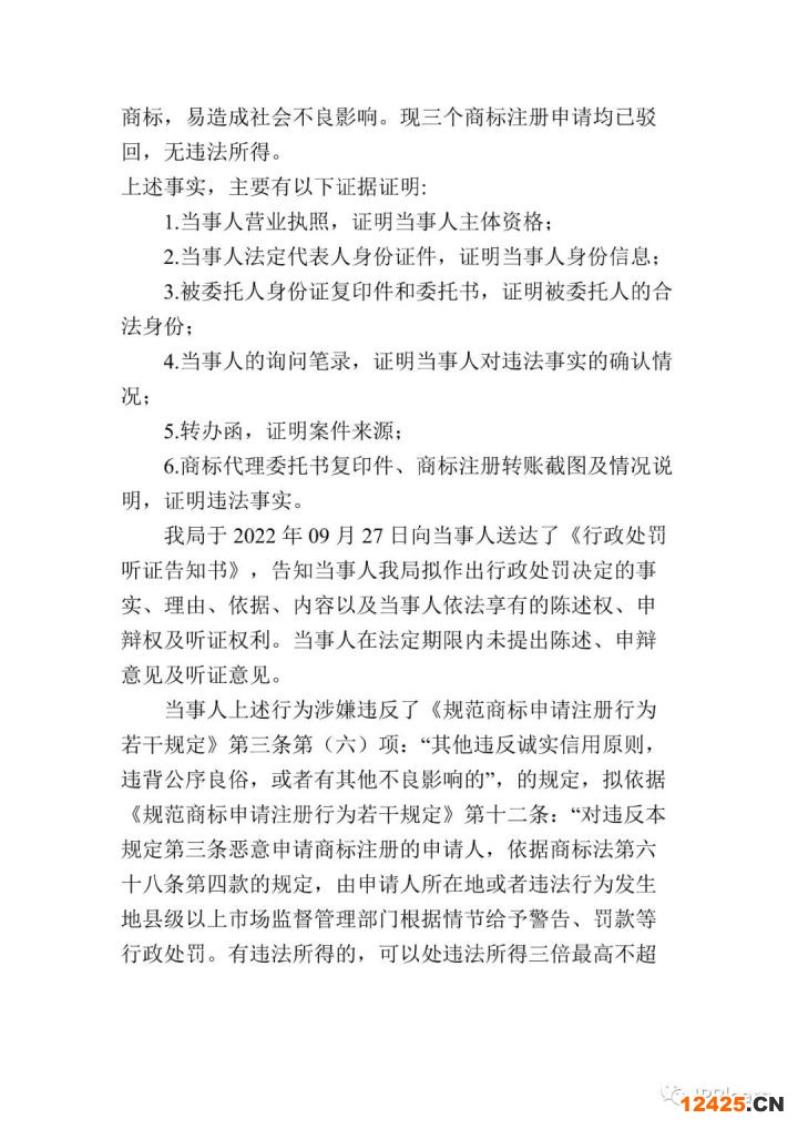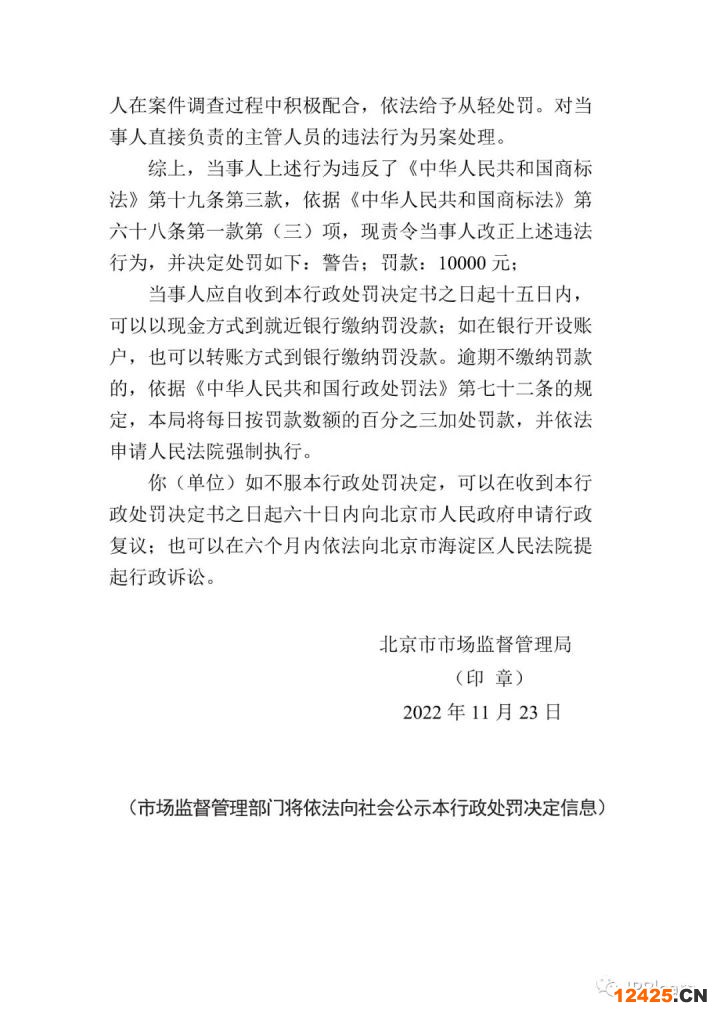 北京某知識產(chǎn)權(quán)代理有限公司明知申請人申請的是“普京頭像”圖形商標,該商標申請行為屬于損害他人現(xiàn)有的在先權(quán)利的行為,仍接受其委托代理上述商標申請,屬于“商標代理機構(gòu)知道委托人申請注冊的商標屬于商標法第三十二條規(guī)定情形,仍接受其委托”,違反了《中華人民共和國商標法》第十九條第三款,本局依據(jù)《中華人民共和國商標法》第六十八條第一款作出行政處罰。鑒于本案涉案金額在5000元以下,當事人在案件調(diào)查過程中積極配合,依法給予從輕處罰。對當事人直接負責的主管人員的違法行為另案處理。綜上,當事人上述行為違反了《中華人民共和國商標法》第十九條第三款,依據(jù)《中華人民共和國商標法》第六十八條第一款第(三)項,現(xiàn)責令當事人改正上述違法行為,并決定處罰如下:警告;罰款:10000元;