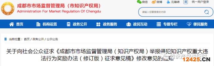 關(guān)于向社會(huì)公眾征求《成都市市場監(jiān)督管理局(知識(shí)產(chǎn)權(quán)局)舉報(bào)侵犯知識(shí)產(chǎn)權(quán)重大違法行為獎(jiǎng)勵(lì)辦法(修訂版)征求意見稿》修改意見的通知