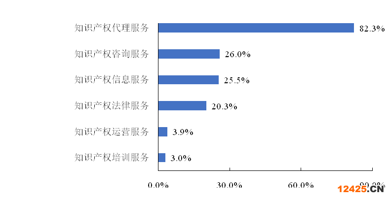 受訪機構中,有710家開展知識產(chǎn)權代理服務,占比為89.8%;343家有開展知識產(chǎn)權咨詢服務,占比為43.4%;184家有開展知識產(chǎn)權法律服務,占比為23.3%;180家企業(yè)有開展知識產(chǎn)權信息服務,占比為22.8%;63家機構有開展知識產(chǎn)權培訓服務業(yè)務,占比為8.0%;44家有涉及知識產(chǎn)權運營服務的機構,占比為5.6%。