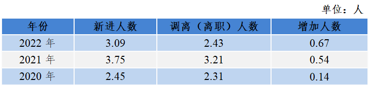 2022年,48.5%受訪的知識產(chǎn)權服務機構有招聘新員工,平均每家機構招聘人數(shù)為3.09人,調離(離職)2.43人,平均單家機構凈增加0.67人。在有新進員工的機構中,46.1%的機構新進有應屆畢業(yè)生,年齡主要集中在20-30歲之間。
