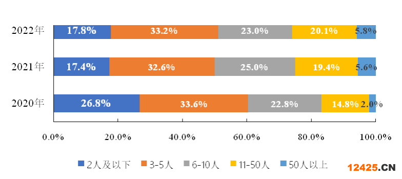 對比2021年、2020年受訪的知識產(chǎn)權服務機構,從業(yè)人員在11-50人及50人以上的機構占比逐年升高,機構規(guī)模正不斷擴大。