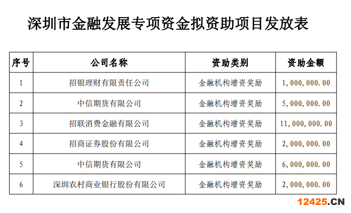 根據(jù)《深圳市支持金融企業(yè)發(fā)展的若干措施》(深金監(jiān)規(guī)〔2022〕2號)、《<深圳市支持金融企業(yè)發(fā)展的若干措施>資助項(xiàng)目申報操作指引》(深金監(jiān)發(fā)〔2022〕36號)的相關(guān)規(guī)定,經(jīng)審核,擬對8家金融機(jī)構(gòu)發(fā)放金融發(fā)展專項(xiàng)資金補(bǔ)助(見附件),現(xiàn)予以公示,公示期為12月13日至12月19日。任何單位和個人對公示項(xiàng)目有異議的,可在公示期內(nèi)來電來函實(shí)名反映相關(guān)情況。