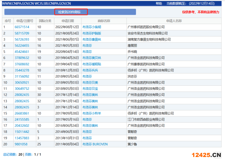 “截至目前共有20件‘布洛芬’相關(guān)商標,其中涵蓋10、16、19、30等多個國際分類。最多的為10類理療設備; 醫(yī)用冷敷貼; 奶瓶;避孕套;縫合材料; 口罩; 醫(yī)療器械和儀器; 牙科設備和儀器; 醫(yī)用體溫計; 電熱敷布(外科)等。”