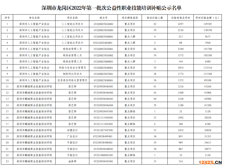 深圳市龍崗區(qū)2022年第一批次公益性職業(yè)技能培訓(xùn)補(bǔ)貼公示