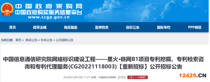 中國(guó)信息通信研究院網(wǎng)絡(luò)標(biāo)識(shí)建設(shè)工程——星火·鏈網(wǎng)B1項(xiàng)目專利挖掘、專利檢索咨詢和專利代理服務(wù)(CG20221118003)【重新招標(biāo)】公開招標(biāo)公告