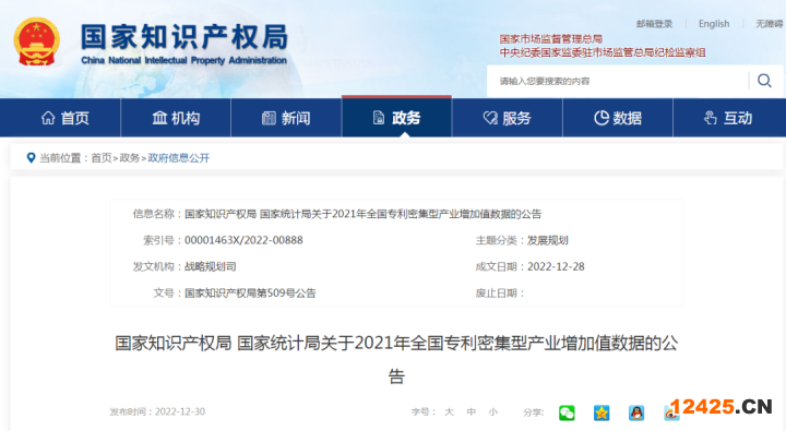 國家知識產(chǎn)權(quán)局 國家統(tǒng)計局關(guān)于2021年全國專利密集型產(chǎn)業(yè)增加值數(shù)據(jù)的公告